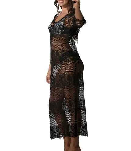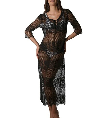 Robe de plage longue dentelle transparente collection Malibu de la marque Luna Splendida. Robe de plage longue totalement transparente, en dentelle jacquard, qui peut être assoiciée à tous vos maillots de bain. Elle complètera votre look d’été en laissant apparaître votre maillot, idéale à porter avec des maillots très colorés pour un contraste saisissant. Pour un look bohème chic sur la plage ou au bar de la piscine. Manches 3/4, encolure avec un lien à nouer. [Robe vendue seule. Le maillot de bain porté par le mannequin sur les photos n’est pas inclus]. Composition: 100% polyamide