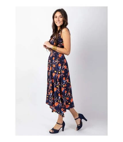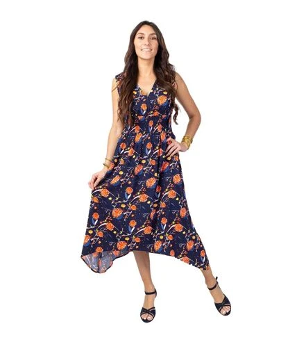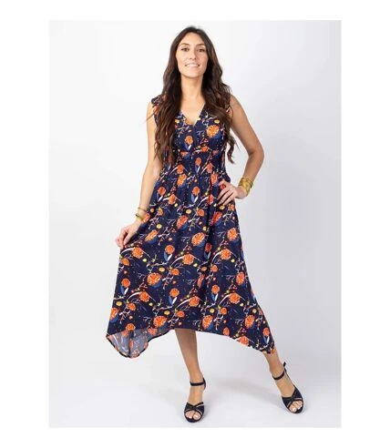 Jolie robe longue chic et féminine. On aime le large smock à la taille qui souligne la silhouette. Sa coupe droite et longue légèrement asymétrique donne du charme à cette rob. Le superbe motif fleuri orangé sur fond bleu marine est à porté avec des sandales à talons pour une allure tendance.