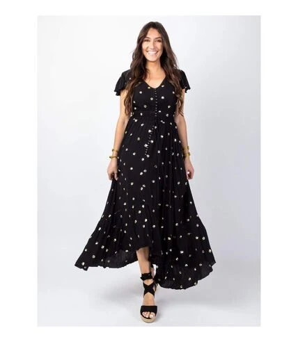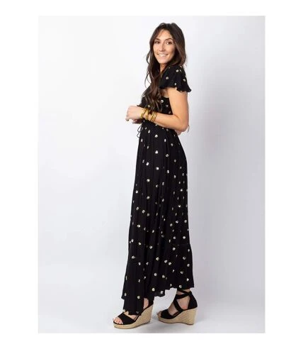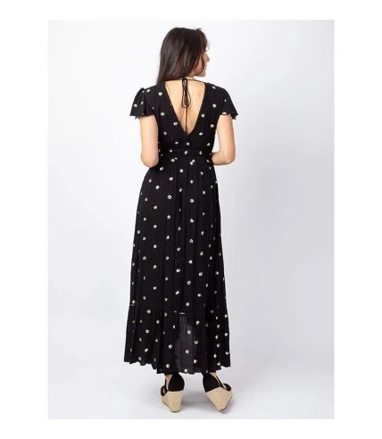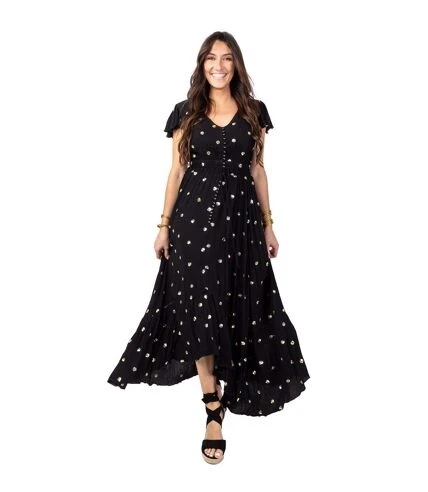 Superbe robe noire tendance ethnique et bohème chic avec ses sequins dorés qui apportent de la fantaisie et une touche de féminité à cette robe longue en viscose crêpe. Facile à porter lors de soirées festives ou de cérémonies, cette robe longue à l’allure ultra féminine existe aussi en blanc.