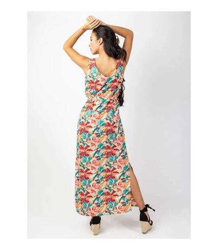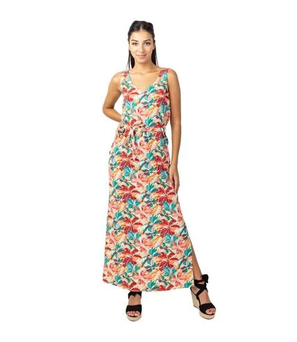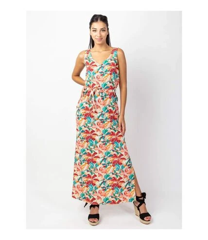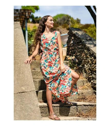 Profitez de vos vacances avec cette jolie robe longue aux motifs fleuris tendance. Coupe longue droite fendue, ceinture amovible du même tissu que la robe, larges bretelles se terminant par une encolure en V.Cette robe en viscose/ coton au superbe imprimé coloré vous accompagnera pendant vos vacances estivales.