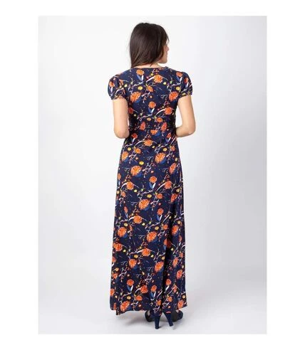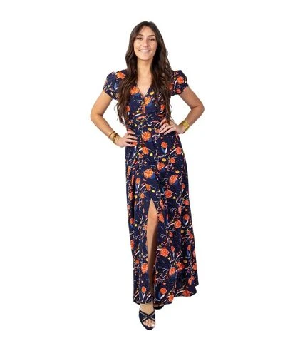 On aime l’imprimé fleuri aux couleurs vivifiantes sur le fond marine/ corail de cette robe longue en viscose, très agréable à porter.Idéale pour un évènement ou une soirée habillée, cette robe légère au motif floral élégant vous donnera une allure féminine et chic.Très stylée avec des sandales à talons bleu marine!