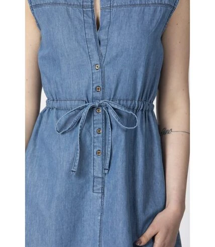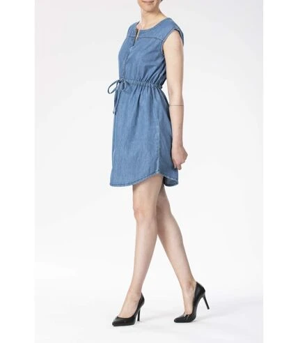 Robe sans manches, col rond ouvert, fermeture sur l’avant à boutons et lien de serrage coulissant à la taille. Chambray bleached 100% coton. Le mannequin porte une taille M.